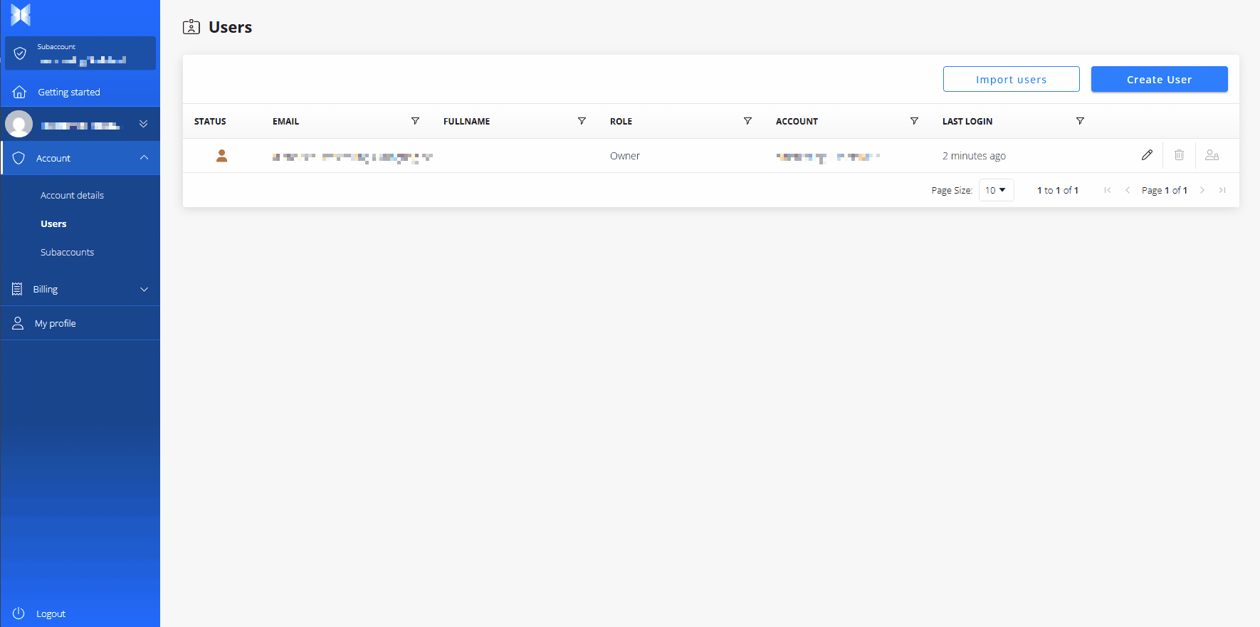 To add users, go to the Users page and click on the Create User button. Enter the user's details and save. You can also select to which subaccounts the user will have access to.