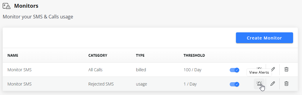 The Naxai Monitors service lets you automatically track your traffic (SMS and voice calls) and receive alerts when configurable thresholds are exceeded. The monitoring is done at the subaccount level.